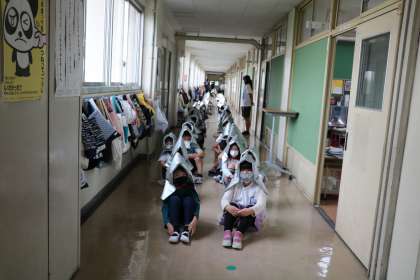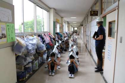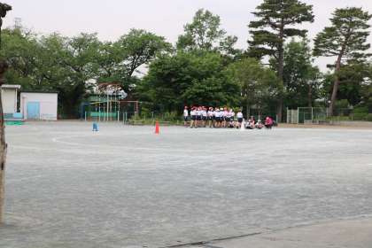 校庭で体育をやっていた6年生は、校舎から遠い場所に整列して人数確認をしています。写真は