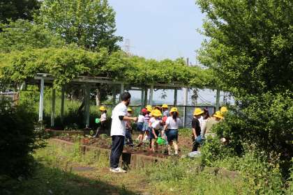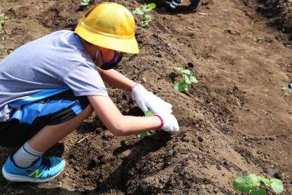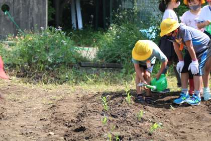 2年生が畑に行き、夏野菜の苗を植えました。教室で苗について調べたり、観察したり、スケッチをした愛着のある大切な苗です。最後に水をたっぷりあげます。みんなで協力して苗植えができました。