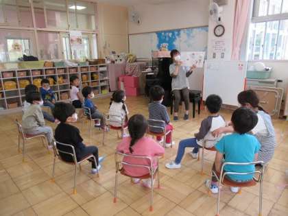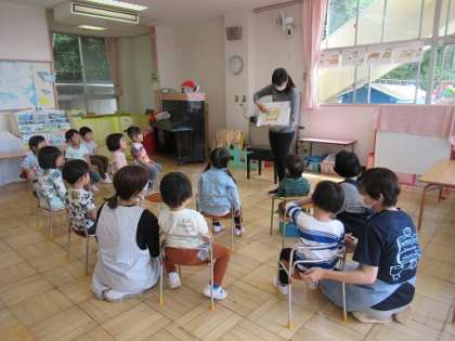 年少組さんは今日からお弁当です。「お弁当、まだ?」と朝から楽しみにしていた子どもたち。担任の先生が、絵表示を使ってお弁当の準備の仕方を話しました。