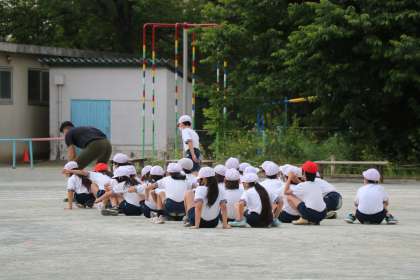 校庭では3年生が80m走の練習です。まずは軽く走って80mの距離やコーナーを走る感覚を感じます。