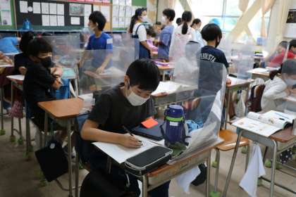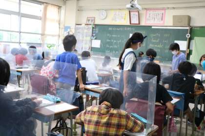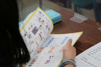 5年生、英語の様子です。自分の名前、好きな色、好きなスポーツなどを紙に書いて友達に紹介します。