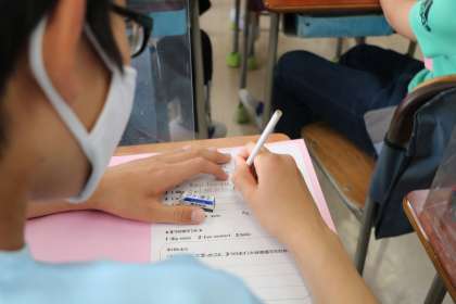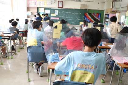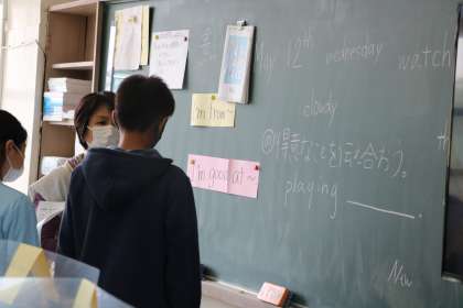 6年生英語の学習の様子です。自己紹介を英語で!先生に相談したりワークシートに書き込んだり、準備しながら楽しそうです。