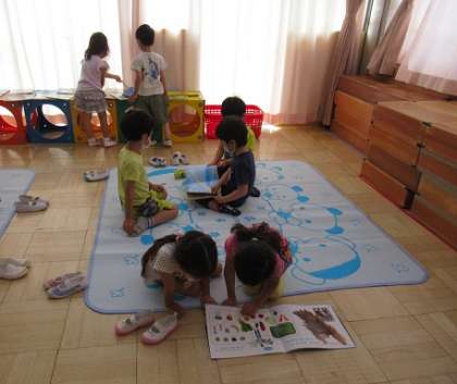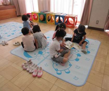 身体測定が終わった後は、一緒に絵本を見て過ごしました。「これからも困った時は言ってね」「なんでも教えてあげるよ」と優しい年長組さんでした。