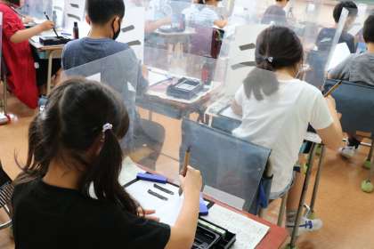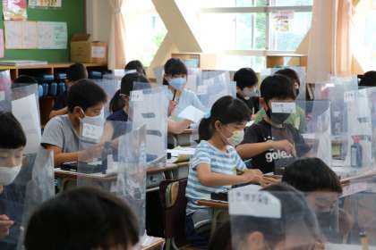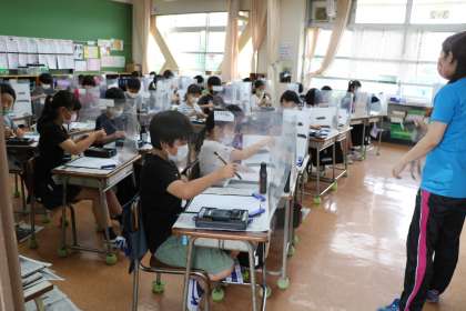 3年生毛筆の学習の様子です。今日のねらいは「とん、すー、とん」何の意味か家で聞いてみてください。
