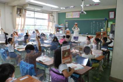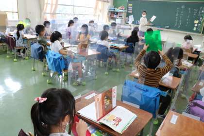 ノートや下敷きをの正しい使い方について、先生の話をよく聞き、反応している子どもたちです。