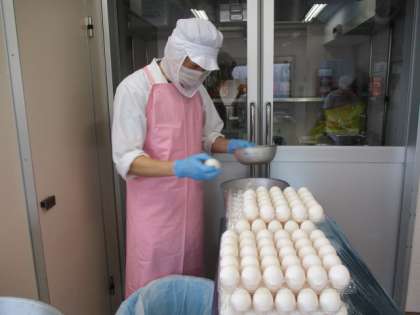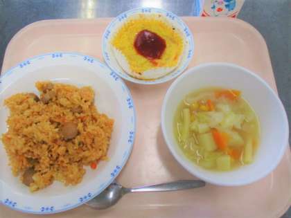 今日の世界の料理給食はアメリカの「ジャンバラヤ」です。チリパウダーでスパイシーな味にしたアメリカ風炊き込みごはんです。写真はオムレツの卵を割っているところです。一人に1個の卵を使うので、約530個の卵を割りました。