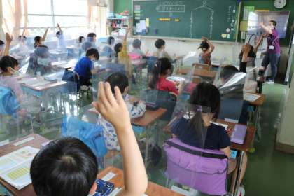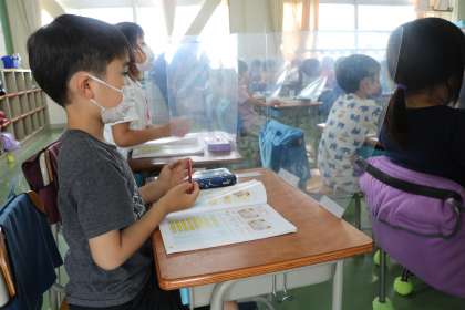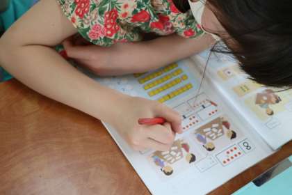 1年生算数の様子です。教科書の○に数字の数だけ色を塗ります。算数では左から、そして上の段から塗っていくというルールがあります。