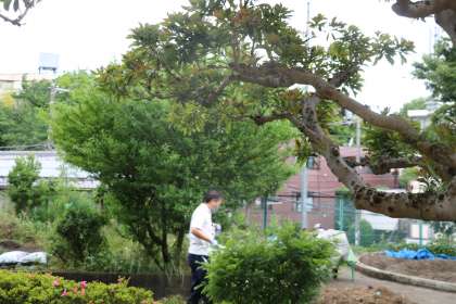 外では、小雨を見計らって主事さんたちが雑草抜きをしています。
