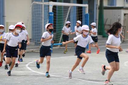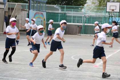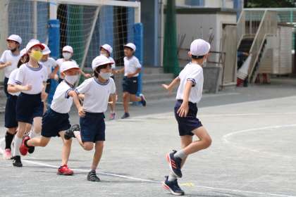4年生体育の学習の様子です。軽くジョギングをしながらバトンパスの練習です。走りながら片手でもらう、またそれをは走りながら走っている相手に渡す。バトンパスは、渡される時も動きながら、という感覚をまず味わいます。