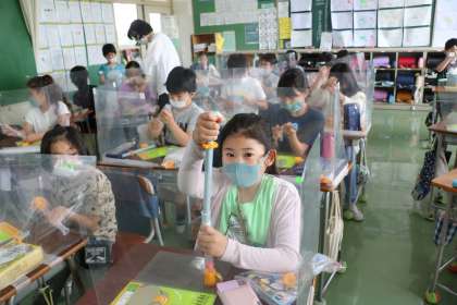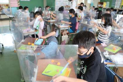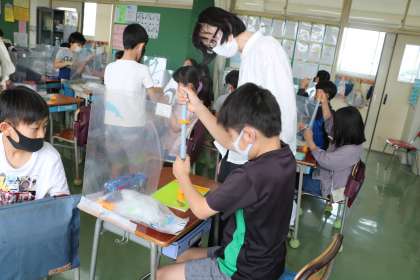 空気鉄砲などになる実験道具を一人ひとつ使い実験です。空気ってどういうものだろう?空気を閉じ込めたらどうなるだろう?子どもたちの疑問に思うことを確かめていきます。