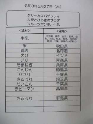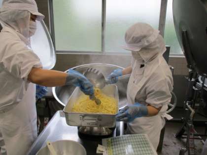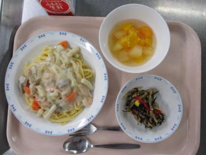 今日のスパゲッティは麺の上に、いか、えび、あさりをたっぷり使ったクリームソースをかけたクリームソーススパゲッティです。クリームソースに使うルウももちろん手作りしています。スパゲッティは家庭と同じように乾麺をゆでて作っています。写真はゆであがったスパゲッティを配缶しているところです。給食室の釜はとても大きいのでひと釜で約200人分ずつゆでられます。うまみたっぷりのクリームソースはとても好評でした。