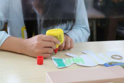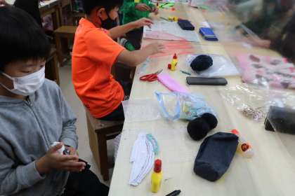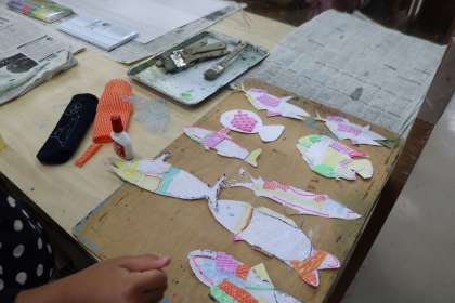 3年生図工「でこぼこ版画」制作の様子です。身近にある緩衝材やひもなどを使い、水の中の生き物の版をつくっています。