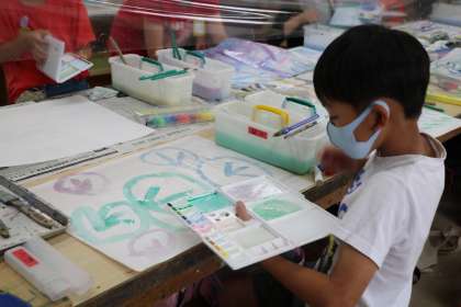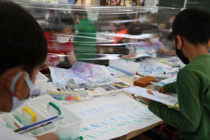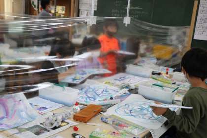 次は絵具と水分をたっぷり使い画用紙に彩色しています。それぞれの想いを、色や模様にしています。