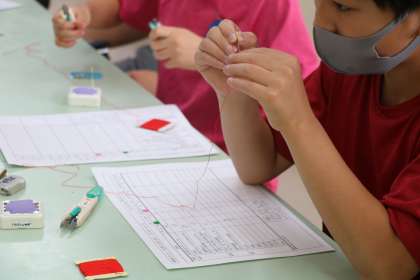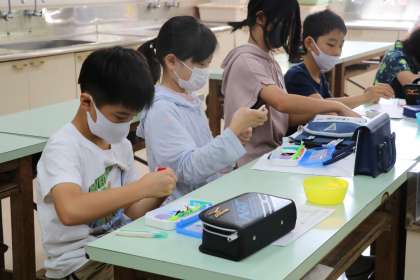 5年生家庭科の様子です。針に糸を通して、縫い方の学習です。まずは糸を通すところから、真剣です。