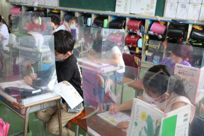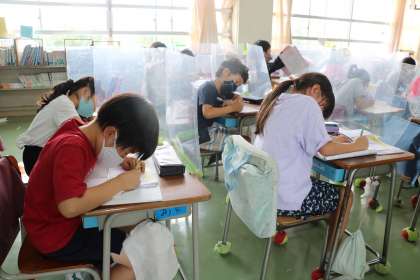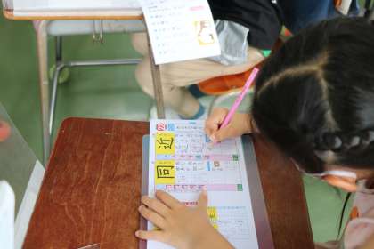 2年生国語の学習の様子です。新出漢字「近」を一生懸命練習しています。先生とみんなで一緒に、漢字の成り立ちや意味、熟語などを確認し言葉集めもいろいろ出てきました。