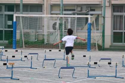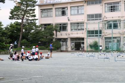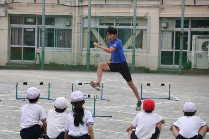 5年生体育の続きです。先生が試技を見せながら細かいポイントを確認します。
