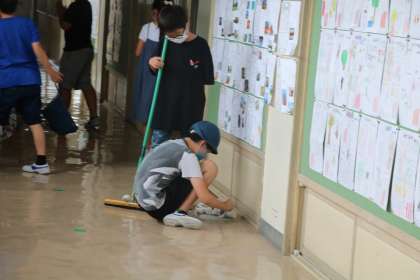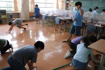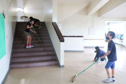 「今年度3回目の自問清掃です・・・」というアナウンスとともに、しっとり音楽がながれ、自問清掃が始まりました。静かに、自分なりにできる仕事を考えながら清掃しています。教室だけでなく、廊下や階段など、担任の先生がいないところでも、きちんと掃除をするのが砧の子のすてきなところです。