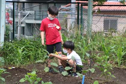 2年生生活科の様子です。畑に行って、植えた夏野菜の観察です。その野菜の色が、茎や花の色からわかる苗もあります。