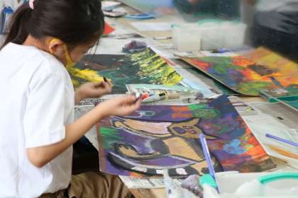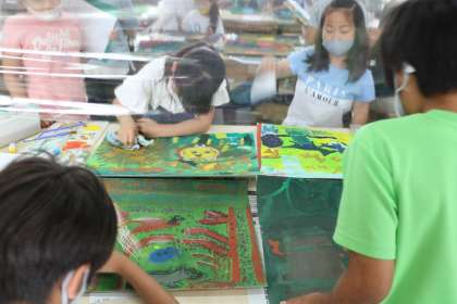 5年生図工「ジャングルの生命」の様子です。友達の作品を鑑賞して工夫を見つけます。見たことも生かして上から絵具を重ねて仕上げに向かいます。