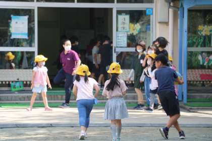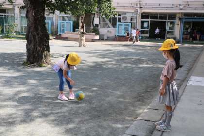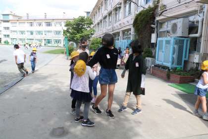 朝のしたくが終わった子が外遊びに出てきます。6年生が1年生と遊ぼうと、来てくれたそうです。大喜びの1年生です。