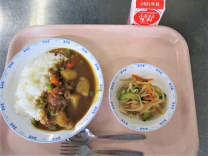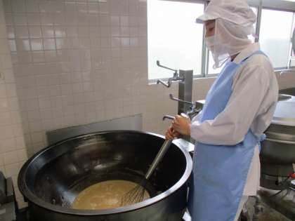 今日は人気メニューのカレーライスでした。どのクラスもとてもよく食べていました。特に1年生が完食してくれたのがうれしかったです。ごはん、カレーもサラダもどれも食缶の中がきれいになくなっていました。写真はカレーのルウを作っているところです。給食のカレーライスはルウも手作りしています。