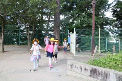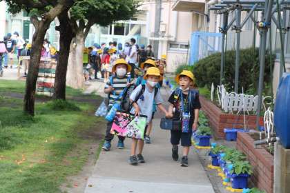 今朝は幼稚園門で子どもたちを迎えました。今日も熱くなりそうですが、朝から元気なあいさつをして登校する砧っ子です。