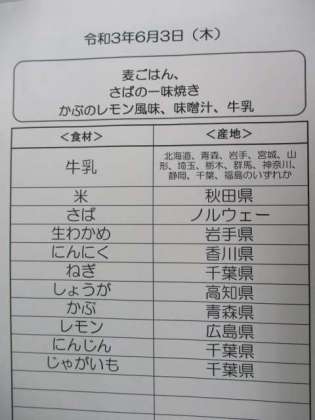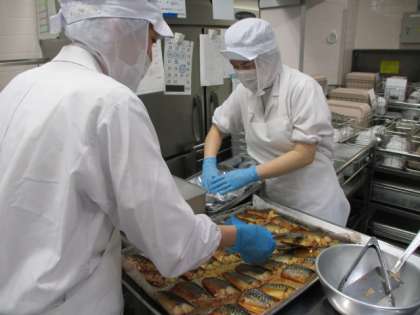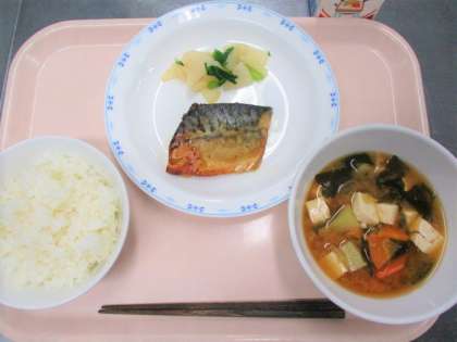 今日の主菜はさばの一味焼きです。一味をつかったたれに漬けこんでから、オーブンで焼きました。一味を使っていますが、辛くはありません。皮がパリッと焼けておいしくできました。さばには体によいあぶらがたくさん含まれているので、皮ごと残さず食べてほしいと思います。写真はさばを配缶している様子です。