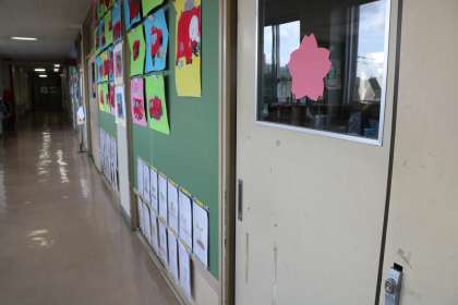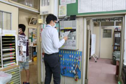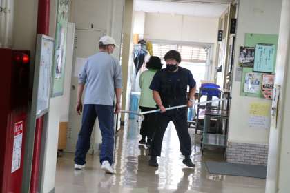 主事さんは、さすまたを使い不審者を追い払う訓練です。校舎内を歩くと教室は電気を消してひっそり静かです。