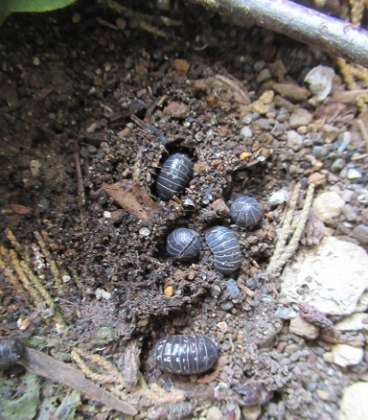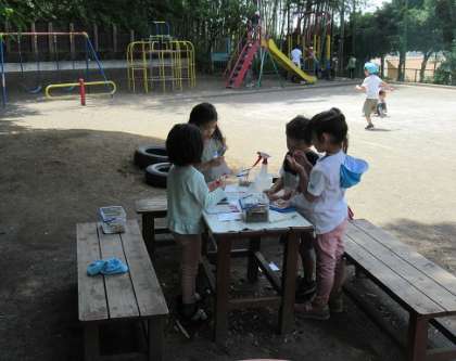 年長組さんが、ダンゴムシをジーっと見ながら絵を描いたりミニ図鑑を見たり…ただいま観察中です。