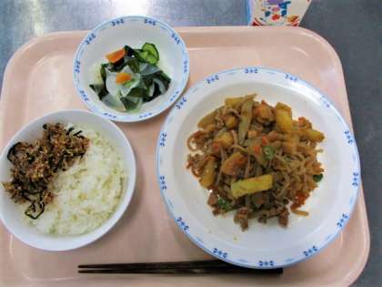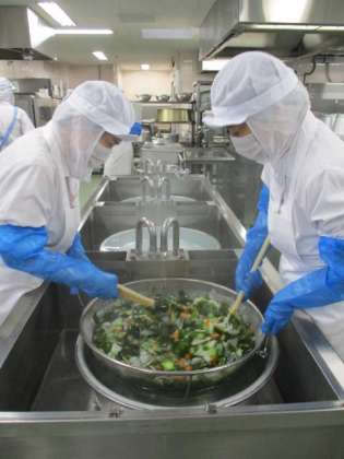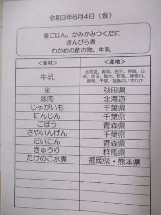 6月4日から10日は「歯と口の健康週間」です。給食では、よくかんで食べることを意識できる「かみかみ献立」を出します。今日のかみかみ佃煮はかみごたえのあるふりかけです。レシピを給食だより6月号にのせています。味もおいしいので、ぜひ作ってみてください。写真は野菜を冷やしているところです。