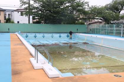 プールでは、朝早くから水を抜いて清掃が始まりました。