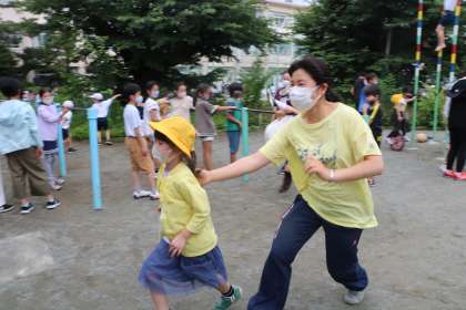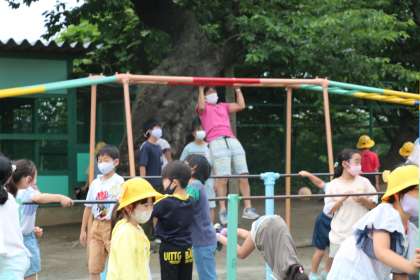 先生は走るのも早いし、うんていで懸垂だってできちゃいます。子どもと一緒になって楽しむ先生たちがすてきです。