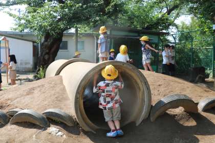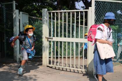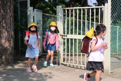 今日は幼稚園門で子どもたちを迎えます。今日は予報通り暑くなりそうな空模様です。