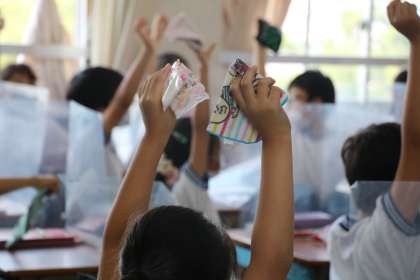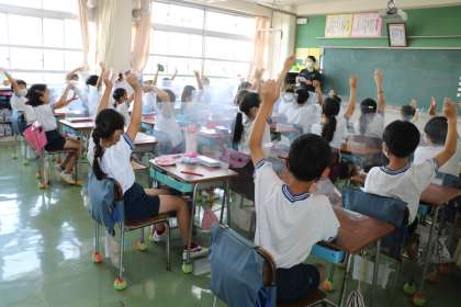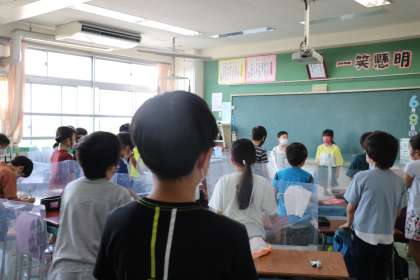 日直さんが前に出て朝の会が始まりました。今朝はハンカチちり紙検査の日です。