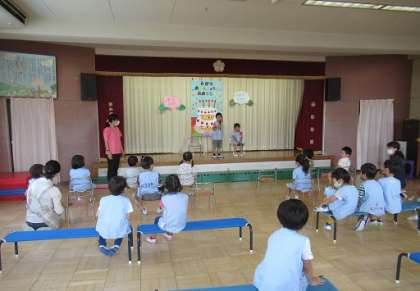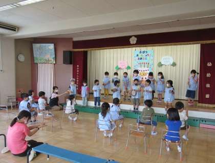 今日は、はな1組・ほし1組の6月生まれの皆さんの誕生会でした。お楽しみは年長組さんの合奏でした。