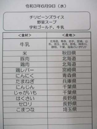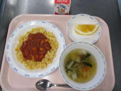 チリビーンズライスに入っているのは大豆です。大豆は良質のたんぱく質が豊富にふくまれていて体によい食品ですが、苦手な子も多いようです。チリビーンズライスにすると、こどもの好きな味つけになり、大豆が食べやすくなります。写真は宇和ゴールドを切っている様子です。食べやすいように、皮と実の間に切れ目を包丁で入れています。
