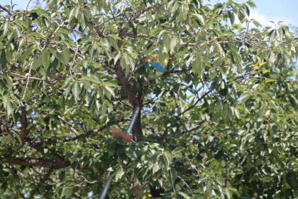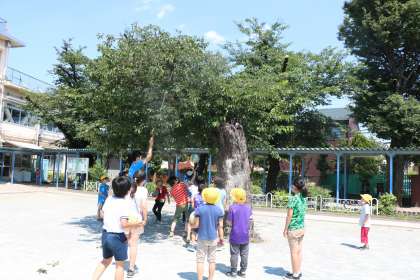 木に引っかかったボールを、ボールで落そうとしたら2個とも木に引っかかってしまいました。そこへ先生登場です。ガキ大将みたいな頼もしい先生です。