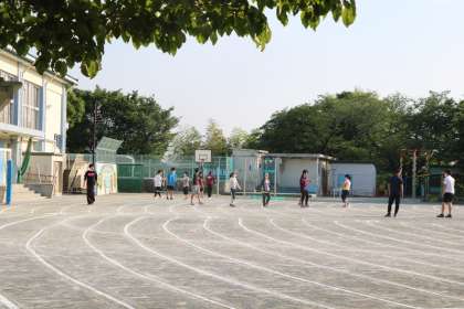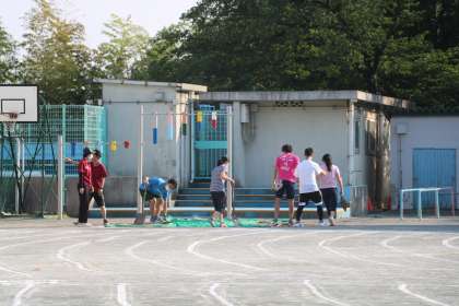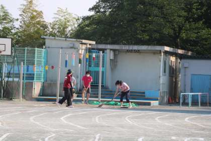 写真は昨日の18時ころの様子です。先生たちがスポーツテストの準備に校庭に出てきています。さらに細かくラインを引くのは朝やります。