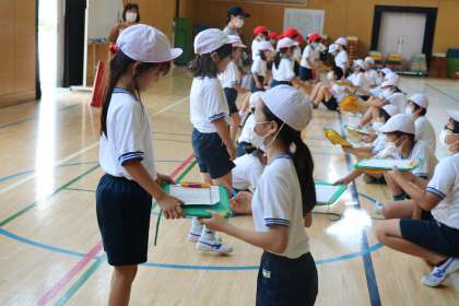やり終わった後にかける言葉、記録の紙を返す時の表情、ちょっとしたしぐさから6年生の優しさが伝わります。見ている私まで心がホカホカになりました。