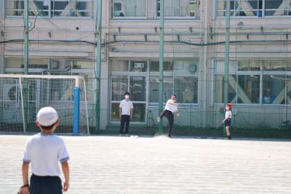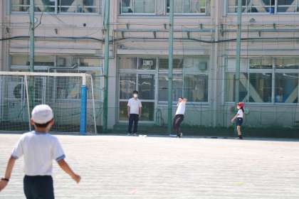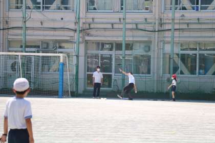 かつて野球少年だった先生が、最後ソフトボール投げに挑戦です。