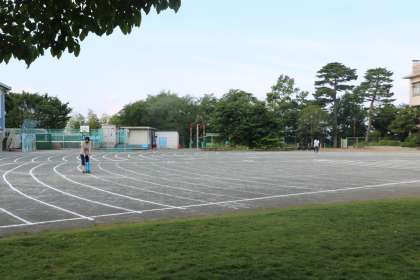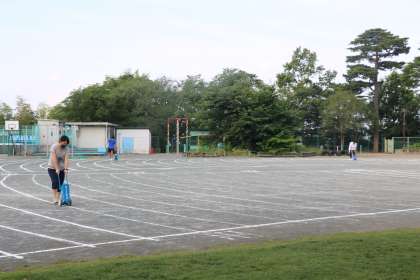 今日は2・4・5年生のスポーツテストです。早朝から先生たちが校庭に出て、ソフトボール投げの線を引いています。