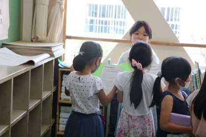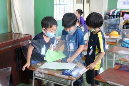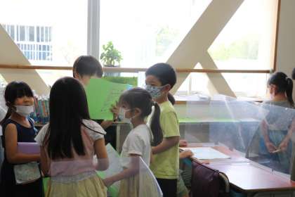 1年生生活科の学習の様子です。学校探検に行く準備をしています。