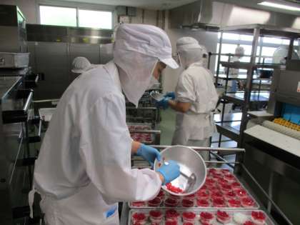 今日は入梅です。この季節はあじさいがとてもきれいですね。給食では入梅に合わせて「あじさいゼリー」を作りました。下の白い部分はカルピスゼリー、上のあじさいの花の部分はブドウゼリーで作りました。写真はカルピスゼリーの上に、1センチ角に切ったブドウゼリーをのせているところです。