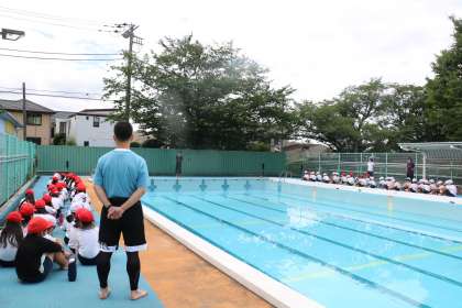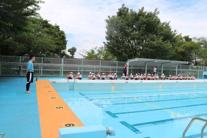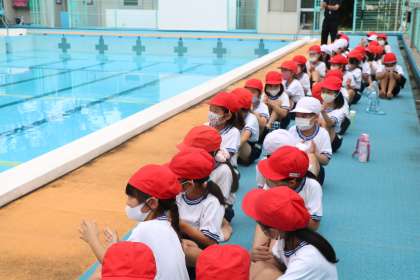 水泳学習は、命に係わる大切な学習です。お喋りをせず、プールサイドに整列している姿に、真剣にがんばるぞ!という子どもたちの一生懸命さが伝わります。