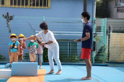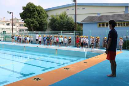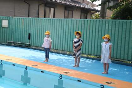 朝の時間1年生が3クラスそろってプール開きをしました。