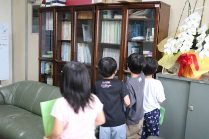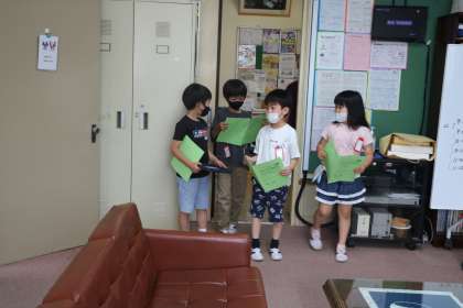 1年生が生活科の学習で「もっともっと学校たんけん」に取り組んでいます。みんなで計画を立てて、もっと知りたい場所を探検します。事前に質問したいことや、訪ねた時のあいさつなど考え練習してきました。今日は、校長室に探検隊が来ました。
