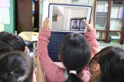 1年生の探検隊です。タブレットで写真を撮ったり、質問をしたりします。