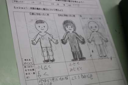 6年生家庭科の学習の様子です。季節に合わせた衣服を絵に描いて、気が付いたことを発表します。夏でもクーラーの効いている場所と校庭ではかなりの温度差があります。寒暖の差を衣服で調節することが、自分でできるようになってほしいです。
