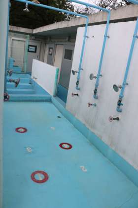 シャワーも1回3人までとし赤いマークのところにだけ入る、