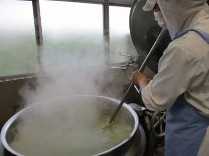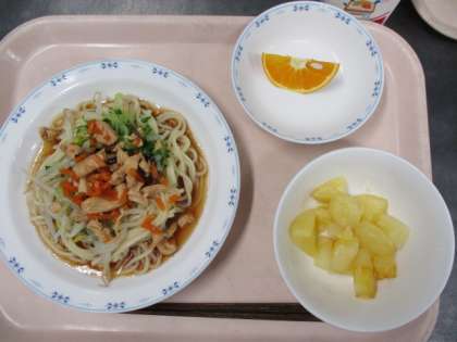 今日は冷やし中華です。給食では夏に一回かならず作るメニューです。毎年こどもたちからつゆがおいしい!ととても好評です。つゆはかつお節のだしをとるところから作っています。先月、こんだてを作成するときは「このくらいはもう暑いだろうから子どもたちが食べやすいように」と思って冷たい冷やし中華をこんだてにいれましたが、今日はあいにくの雨でした。写真はめんをゆでているところです。